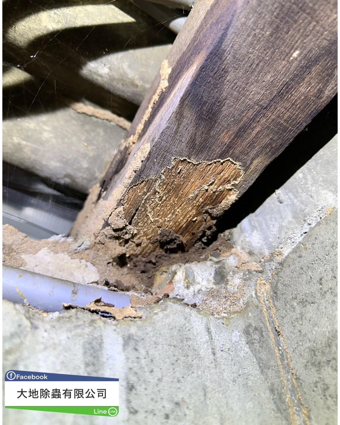 經我們場勘時發現屋頂木樑也有被白蟻攻擊的現象