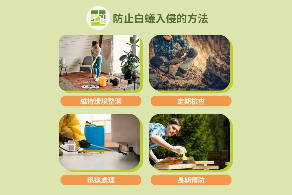 - 維持環境乾爽整潔:因為白蟻喜歡潮濕的地方,我們可以通過改善通風狀況來降低濕度,例如定期開窗或使用除濕機。此外,還應清理房屋周圍的木材、樹葉等有機物質,減少白蟻的食物來源。